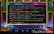 The bazaar is full of objects of mystery and wonder -- a perfect place for finding your fortune! Scatters and free games await you after obtaining three or more hand symbols. A generous multiplier will also be applied to the spins if a Grand Bazaar symbol appears.