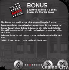 A 5 reel, 20 line slot with a classic Hollywood film noir theme and an art style inspired by Frank Miller's Sin City. The Starlite Bonus is a 5-stage pick game featuring a classic swing jazz track. Players navigate bonus level floors using the Starlite Lift to find Hollywood's best party.
