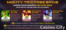 Make this world a better place with the brave Mighty Trio! Catch three Bonus symbols on the reels and choose one out of three Free Spins modes. Take 15 free spins with stacked Wilds, 10 free spins with Expanding Wilds or 5 Free Spins with Sticky Wilds!