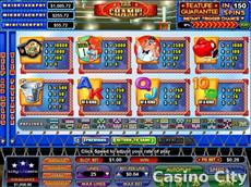 The Champ is an intense boxing themed slot featuring Pugilist Pete and Boxing Bob as the wild boxers appearing on reels 1 and 5 only. Spin the reels to win one of the progressive jackpots at random. The Feature Guarantee is offered guaranteeing that the free games feature will trigger within 150 spins.
